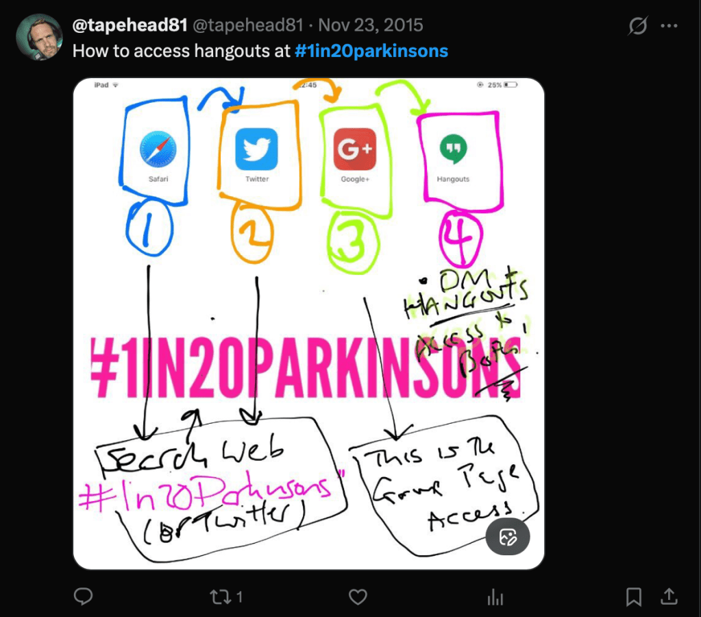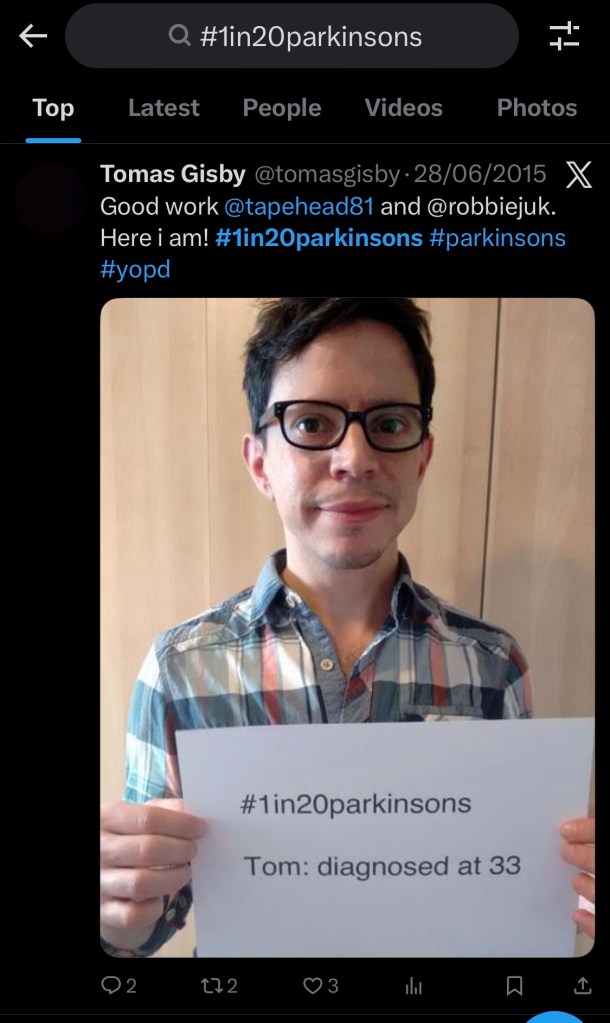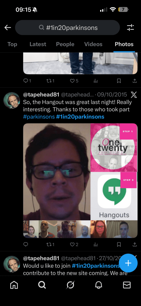 In late 2014 I joined Twitter and started writing short posts with a video or photograph – a kind of journal of the day-to-day with ‘#Parkinsons’ – little did I know that there was a whole world out there with people of all ages and, most interesting to me, a younger population of people living with #Parkinsons – people like Zoe in Greater Manchester and Martin in Edinburgh – they too were recently diagnosed and in their 30’s – both of whom I met in person and remained friends ever since.